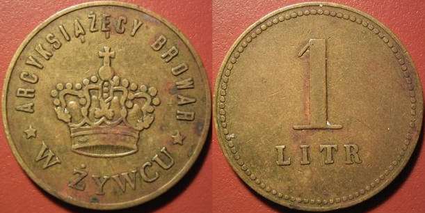 Jak już wspomniałem wyżej również poszczególne browary wynagradzały dodatkowo w ten sposób swoich pracowników. Za znaki te pracownicy browaru mogli pobierać odpowiednią ilość piwa w magazynie czy też sklepie firmowym. Zaprezentuję przykłady takich żetonów z browaru w Żywcu i we Lwowie.