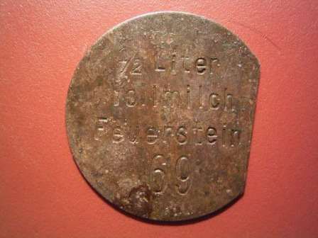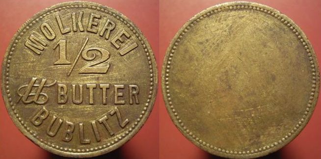 W tym miejscu wspomnę raz jeszcze o deputatach wydawanych pracownikom w majątkach ziemskich, znane z literatury żetony pozwalały na otrzymanie na ich podstawie mleka i masła jak choćby prezentowane wcześniej żetony z Chwalkowa czy też emisje na 1 litr mleka ze Sławięcic, te ostatnie opatrzone są kolejnym numerem, który odpowiadać miał liczbie dni w miesiącu. Z zachowanych przekazów wynika bowiem że w majątku Sławięcice służba pałacowa otrzymywała co miesiąc po rulonie takich żetonów, po jednym na każdy dzień. Inny charakter musi mieć jednak numer na prezentowanym niżej żetonie z Krzemieniewa, gdyż posiada cyfrę przekraczającą ilość dni w miesiącu, podobnie zresztą jak na ujawnionych ostatnio żetonach z Bieńkowic koło Wodzisławia Śląskiego opiewających na 1 Ltr (?).